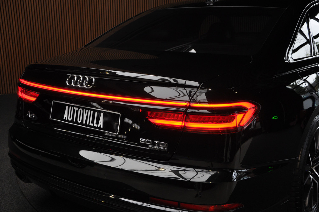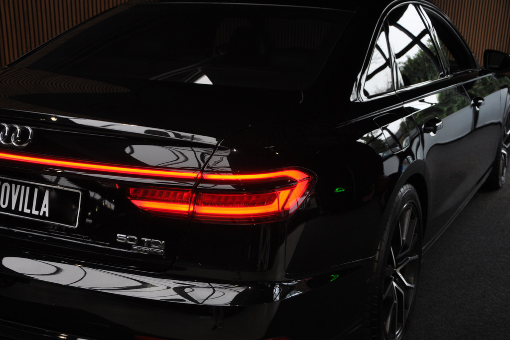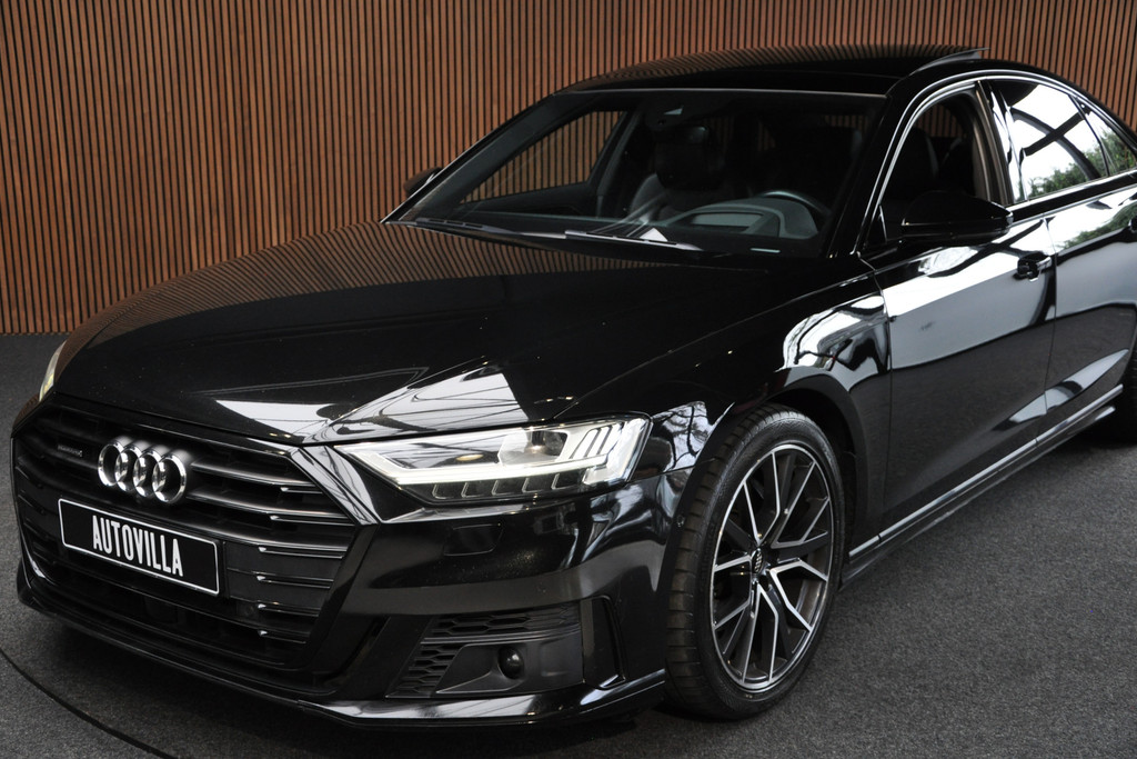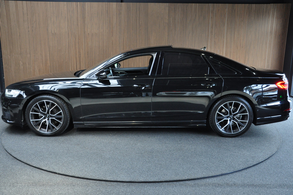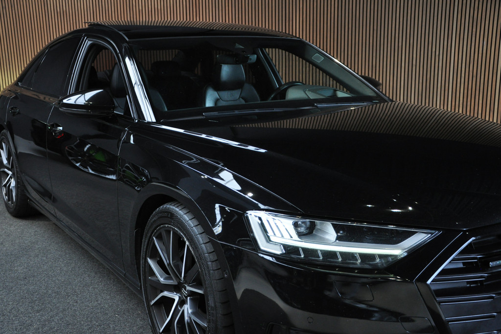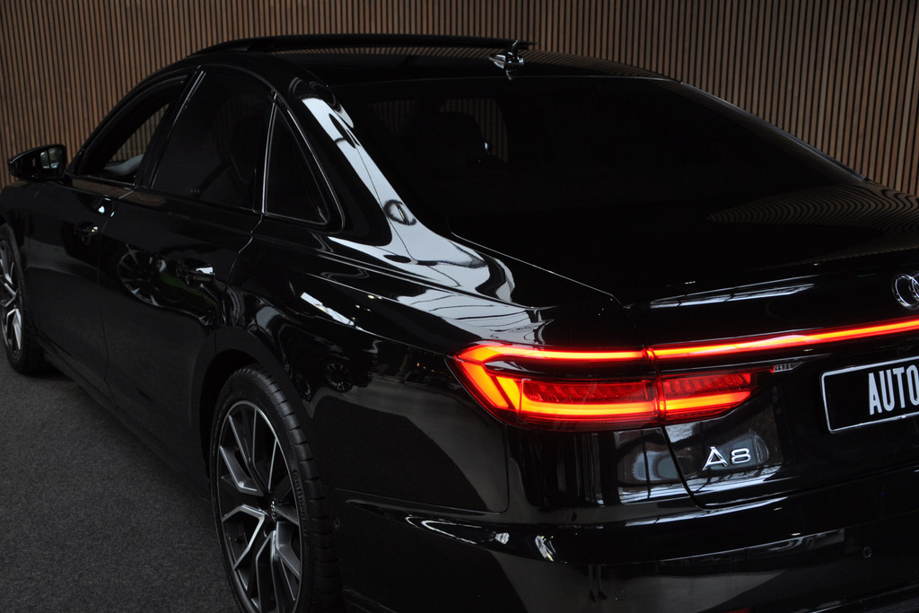 Deze diepzwarte Audi A8 staat voor pure klasse en comfort van het hoogste niveau. Stalen onverzettelijkheid, een en al kracht en betrouwbaarheid. De aandrijving wordt verzorgd door een zescilinder dieselmotor en een automatische transmissie. Het met leer beklede interieur geeft deze auto een gedistingeerde uitstraling. Dankzij de elektrische stoelbediening is het gemakkelijk om de optimale zitpositie te vinden. Wat een licht geeft dat glazen elektrisch bedienbare panoramadak. De elektrische achterklep opent met een druk op de knop, zodat u gemakkelijk toegang heeft tot de bagageruimte. Opvallend is de geavanceerde matrix LED-verlichting met daglichtkwaliteit. De koplampen dimmen automatisch het deel van de lichtstraal waar voor- of tegenliggers in rijden. De overige segmenten blijven aan en verlichten de weg maximaal. Tot de uitrusting van deze Audi behoren ook elektrische zonnerollo voor de achterruit, 20 inch lichtmetalen velgen, adaptief dempingsysteem, warmtewerend glas, elektrisch inklapbare buitenspiegels en LED-achterlichten.