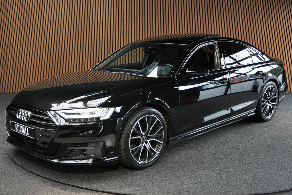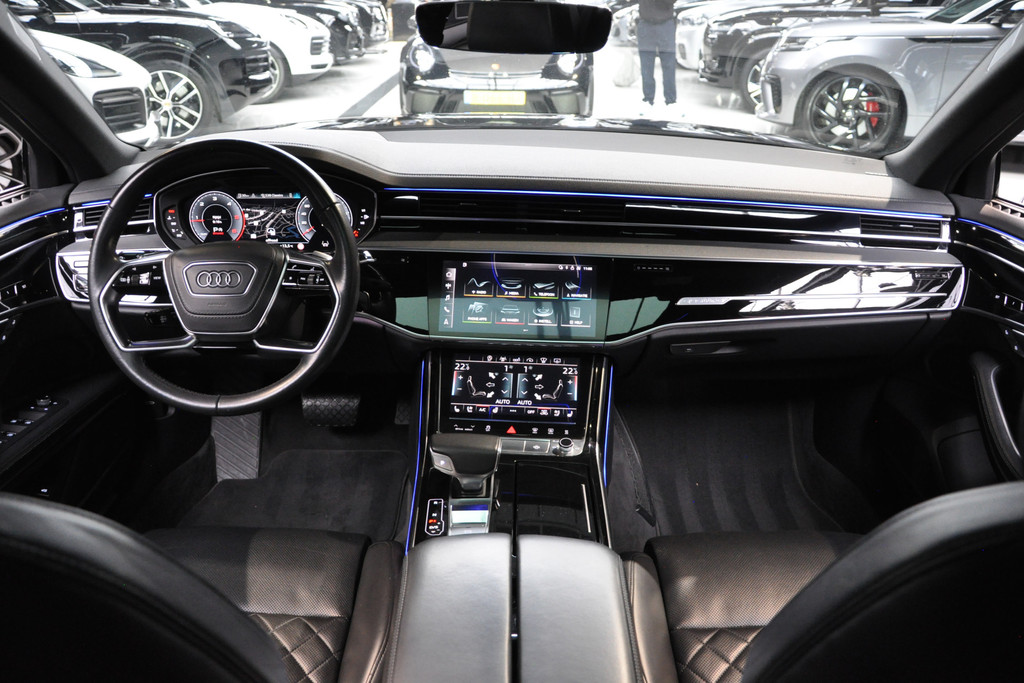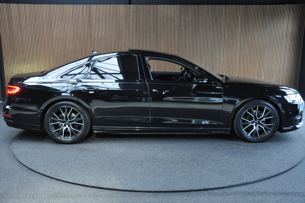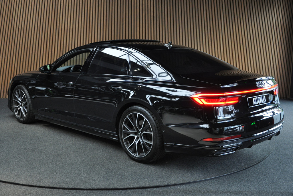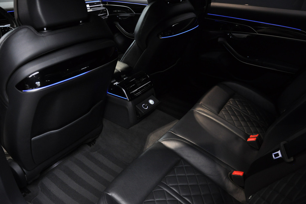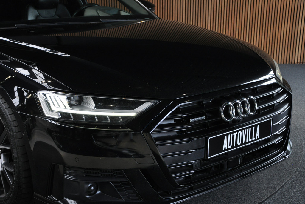 Deze diepzwarte Audi A8 staat voor pure klasse en comfort van het hoogste niveau. Stalen onverzettelijkheid, een en al kracht en betrouwbaarheid. De aandrijving wordt verzorgd door een zescilinder dieselmotor en een automatische transmissie. Het met leer beklede interieur geeft deze auto een gedistingeerde uitstraling. Dankzij de elektrische stoelbediening is het gemakkelijk om de optimale zitpositie te vinden. Wat een licht geeft dat glazen elektrisch bedienbare panoramadak. De elektrische achterklep opent met een druk op de knop, zodat u gemakkelijk toegang heeft tot de bagageruimte. Opvallend is de geavanceerde matrix LED-verlichting met daglichtkwaliteit. De koplampen dimmen automatisch het deel van de lichtstraal waar voor- of tegenliggers in rijden. De overige segmenten blijven aan en verlichten de weg maximaal. Tot de uitrusting van deze Audi behoren ook elektrische zonnerollo voor de achterruit, 20 inch lichtmetalen velgen, adaptief dempingsysteem, warmtewerend glas, elektrisch inklapbare buitenspiegels en LED-achterlichten.
