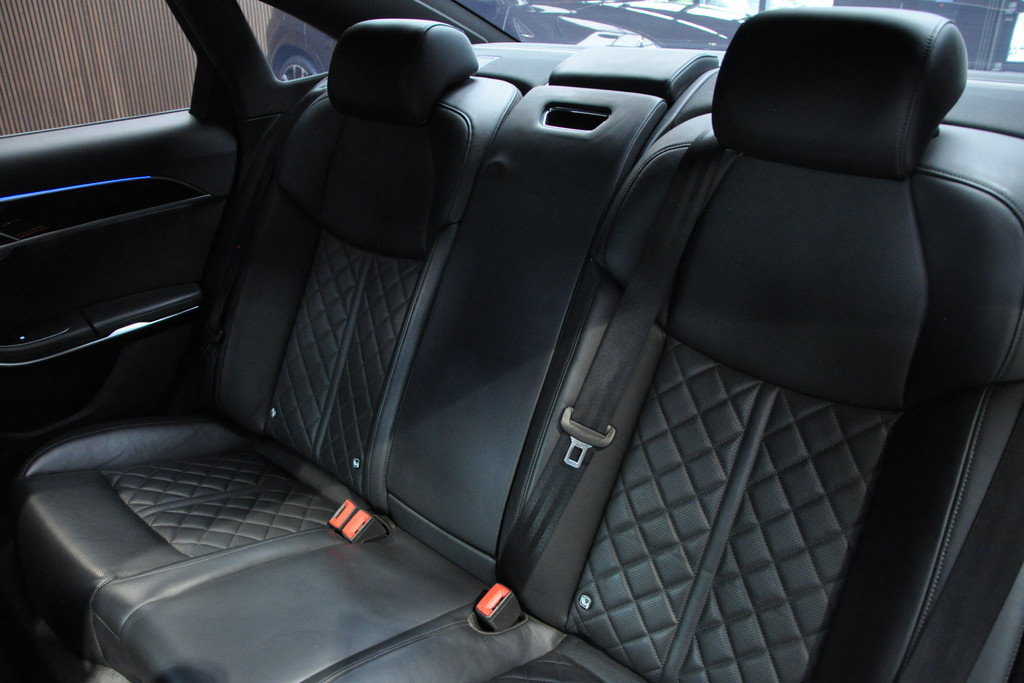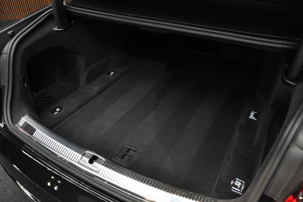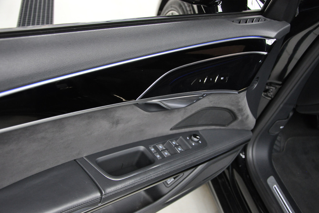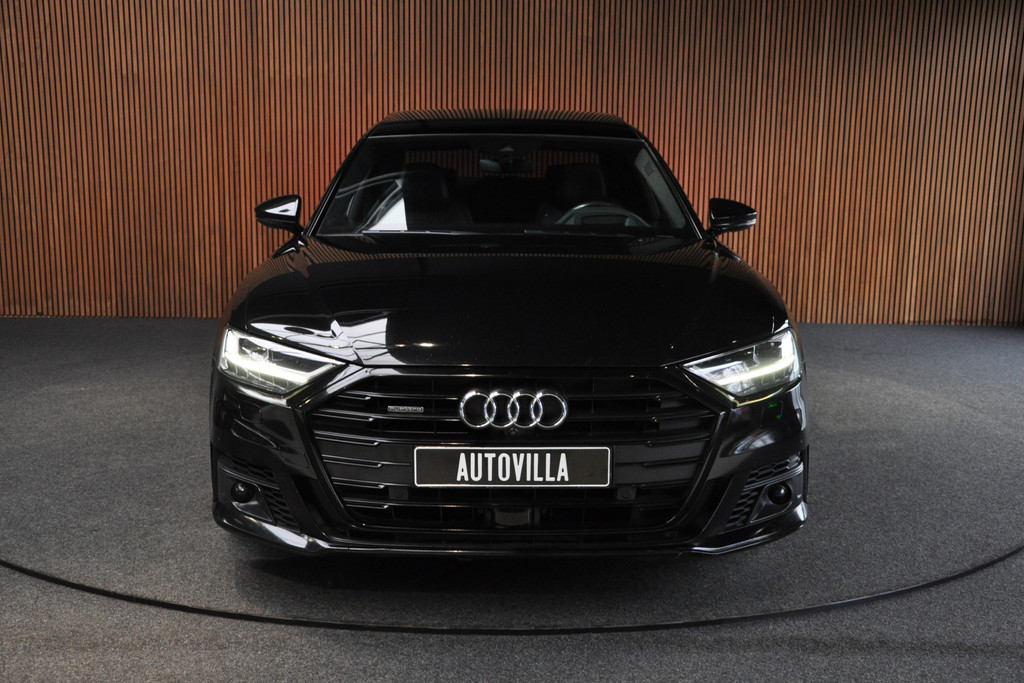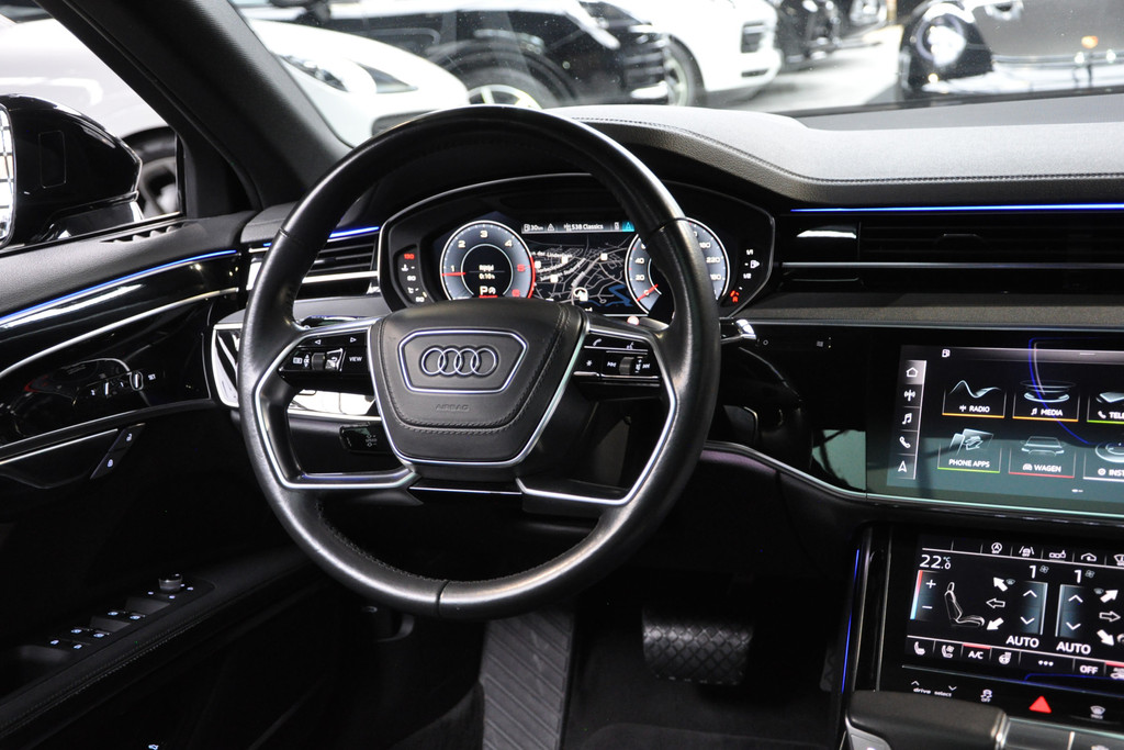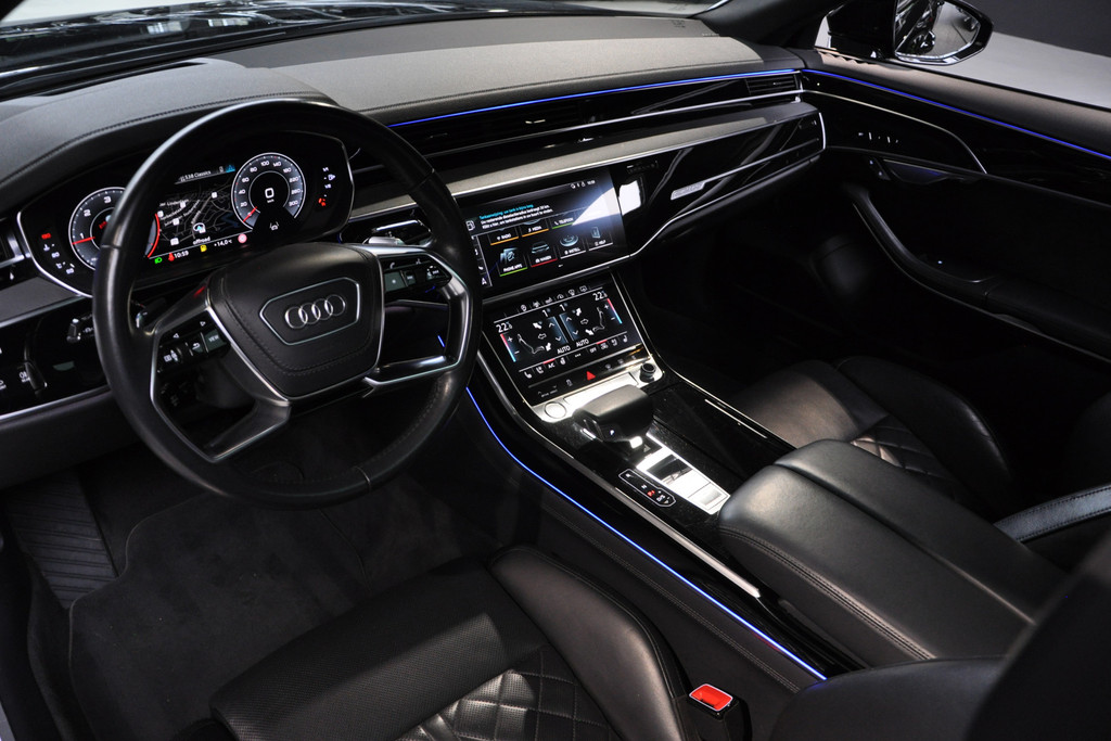 Deze diepzwarte Audi A8 staat voor pure klasse en comfort van het hoogste niveau. Stalen onverzettelijkheid, een en al kracht en betrouwbaarheid. De aandrijving wordt verzorgd door een zescilinder dieselmotor en een automatische transmissie. Het met leer beklede interieur geeft deze auto een gedistingeerde uitstraling. Dankzij de elektrische stoelbediening is het gemakkelijk om de optimale zitpositie te vinden. Wat een licht geeft dat glazen elektrisch bedienbare panoramadak. De elektrische achterklep opent met een druk op de knop, zodat u gemakkelijk toegang heeft tot de bagageruimte. Opvallend is de geavanceerde matrix LED-verlichting met daglichtkwaliteit. De koplampen dimmen automatisch het deel van de lichtstraal waar voor- of tegenliggers in rijden. De overige segmenten blijven aan en verlichten de weg maximaal. Tot de uitrusting van deze Audi behoren ook elektrische zonnerollo voor de achterruit, 20 inch lichtmetalen velgen, adaptief dempingsysteem, warmtewerend glas, elektrisch inklapbare buitenspiegels en LED-achterlichten.