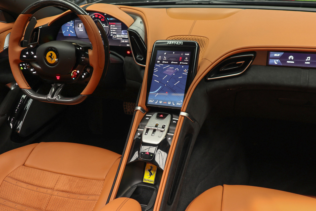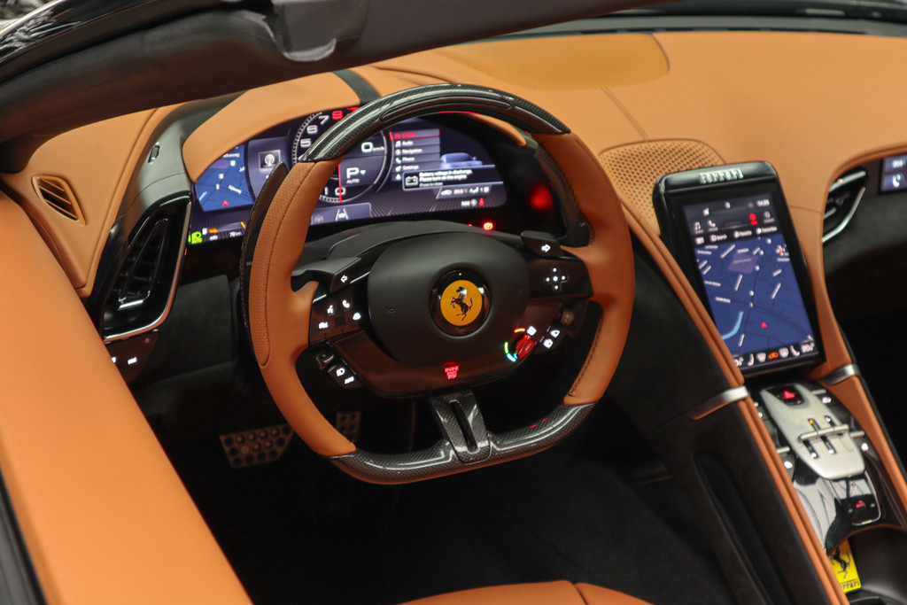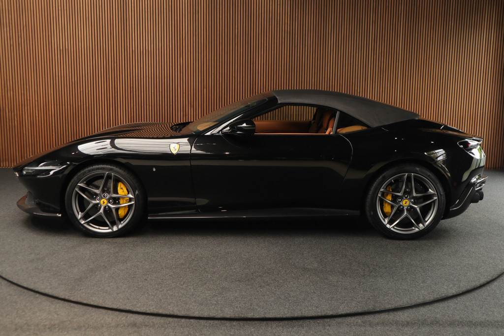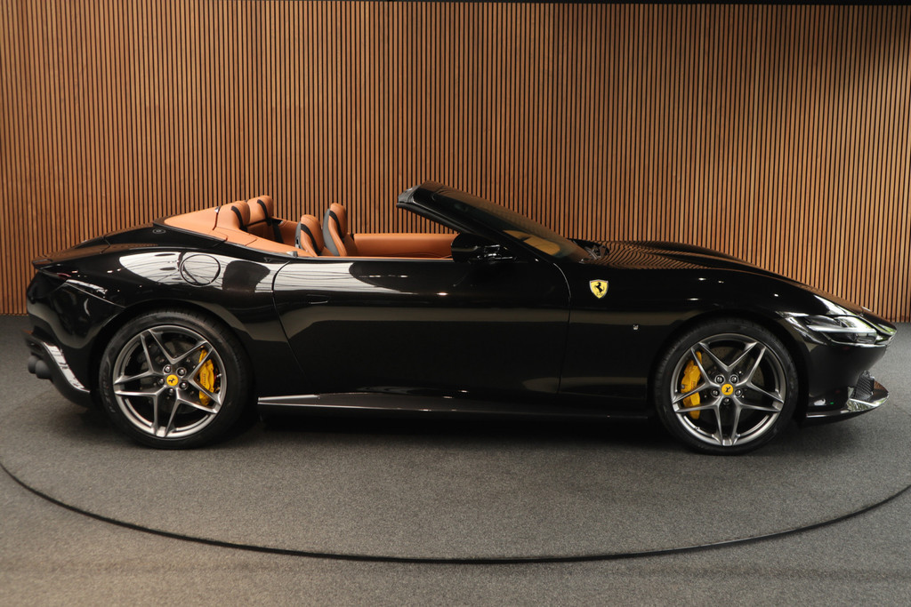 Deze prachtige en nieuw samengestelde Ferrari Roma spider in kleur zwart metallic ( Nero ) gecombineerd met de kleur interieur kleur Cuoio heeft een bijzondere kleuren combinatie.