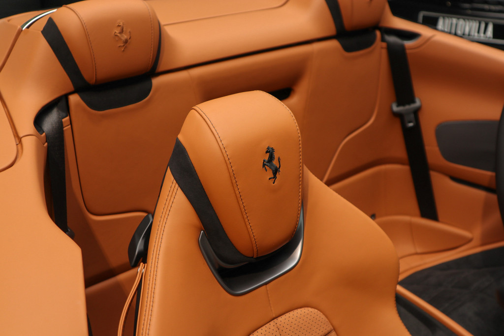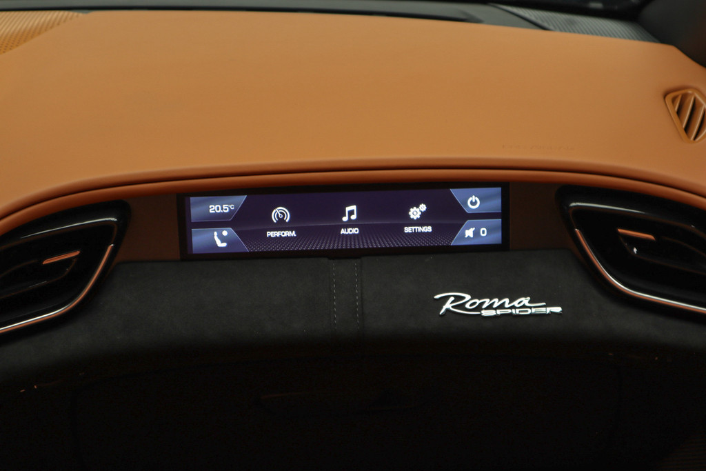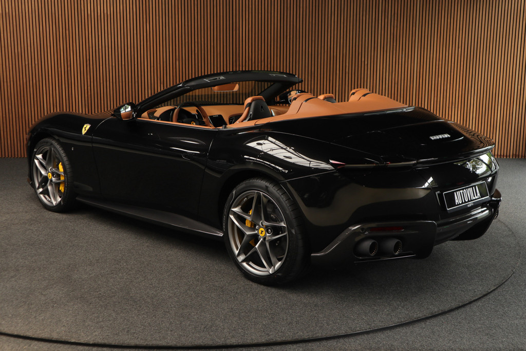 Deze prachtige en nieuw samengestelde Ferrari Roma spider in kleur zwart metallic ( Nero ) gecombineerd met de kleur interieur kleur Cuoio heeft een bijzondere kleuren combinatie.