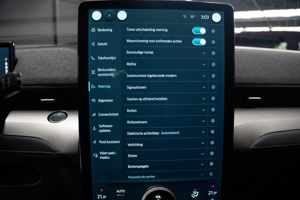 De Ford Mustang Mach-E is ook voorzien van ADAS. Deze Advanced Driver Assistence Systems fungeren als extra ogen en oren: ze houden voor u de weg in de gaten en grijpen in wanneer dat nodig is. Een belangrijke bijdrage aan de veiligheid onderweg levert de verkeersbord-detectie. Voorzien van het Lane-keeping systeem. Ofwel: blijf automatisch in je baan. De forward collision warning reduceert het gevaar van een botsing met een voorligger significant. Dankzij veiligheidsvoorzieningen als dodehoekdetectie, vermoeidheidsherkenning, autonoom remsysteem en bandenspanningcontrolesysteem, bent u steeds veilig onderweg.